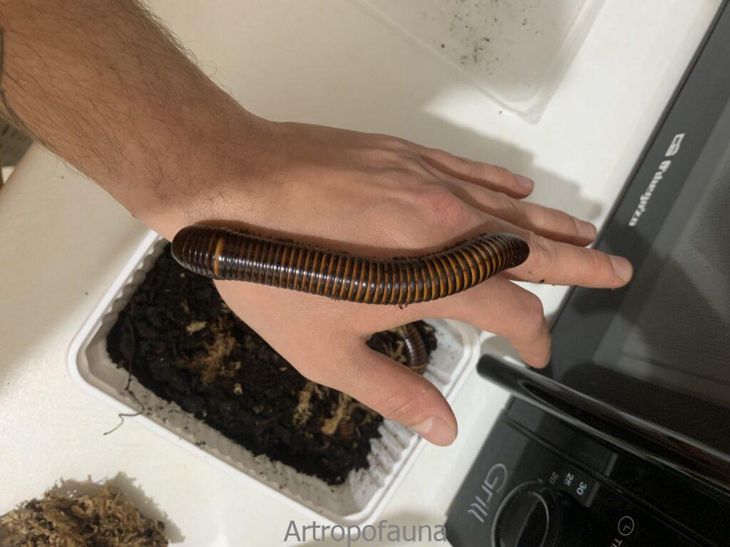 Existen especies como esta que alcanza los 18 cm de longitud y la madurez sexual a los 2 años, tiempo en el que pueden reproducirse y tener crías. Son muy dóciles, lentos y sociables con otros milpiés, totalmente inofensivos para los humanos. Necesitan una temperatura de entre 22 y 28º, siendo la temperatura óptima los 23º (no hace falta una manta de calor siempre y cuando la temperatura no descienda de los 18º, aun así, hay que tener en cuenta que pueden aguantar mejor las temperaturas bajas que las altas). Humedad entorno al 80-90%, para conseguirlo, el sustrato debe estar húmedo. Como sustrato recomiendo una mezcla entre compost orgánico natural, turba rubia y humus. Recomendable también introducir y esparcir trozos de corteza de roble descompuesta por todo el sustrato, así como hojarasca de roble y castaño, musgo, cuevas de corteza y troncos. Aunque no es necesario, las cortezas que tengan liquen son una mejor opción ya que también se alimentan de él.