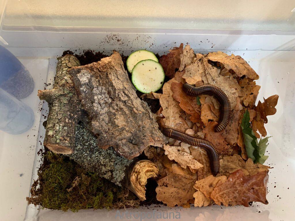 Primeramente, es importante saber cuánto miden los ejemplares que vayamos a meter en el terrario y cuántos van a convivir en él. De largo tiene que medir por lo menos el doble de la longitud del milpiés. Si mis milpiés miden 15 cm de largo, es necesario que el largo del terrario mida al menos 30 cm. Es importante que dispongan de espacio para que realicen bien las mudas. El alto del terrario es quizás menos importante para las especies no escaladoras, aunque hay que dejar al menos la medida del largo del milpiés para la altura del terrario. Si mi milpiés mide 13 cm de largo, debería dejar al menos una altura del terrario de 13 cm. Para las especies escaladoras la altura es más importante y habría de ser más alto.