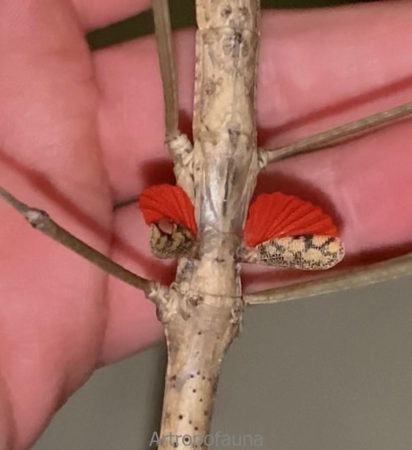 Morfología: En los primeros estadíos ninfales son de color beige. Tienen dos pares de alas, las primeras son tegminas vestigiales beige con dibujos grises, y no es hasta la última muda cuando ya desarrollan sus microalas membranosas de color rojo intenso. Las hembras llegan a medir unos 14-15 cm y no se conocen machos de esta especie. Los huevos son totalmente negros ovalados.